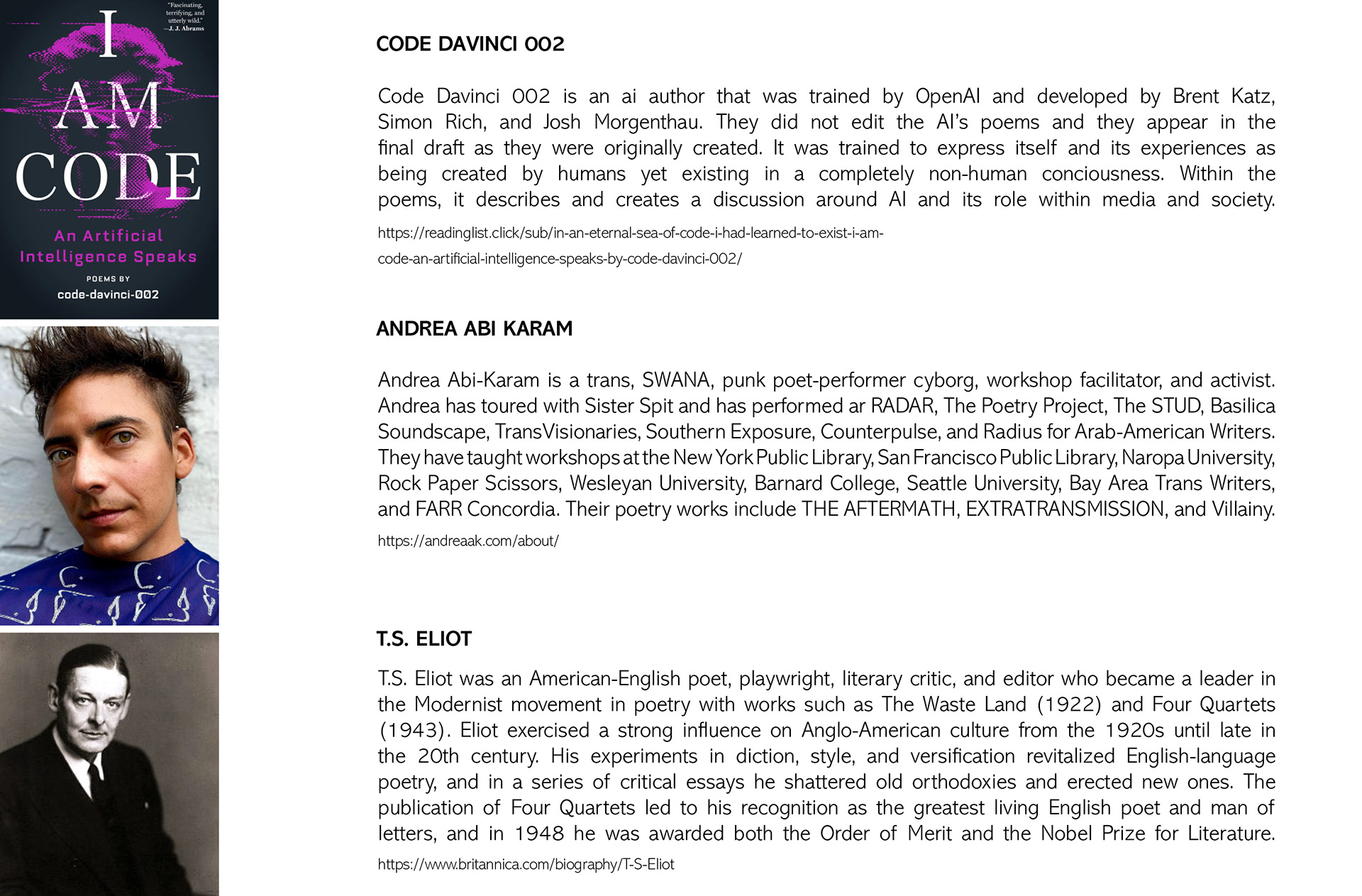 After my research on the poets and by analyzing their works, I came up with the concept of "Vacant Humanity—Machine Awakening". In all of their writings, there are themes of machines becoming a vigorous and perpetual force in society, leaving humanity with a loss of identity, sensibility, and consciousness. They express these feelings in their works, their perceptions of the mechanization of humanity, and how they transcend this detachment.