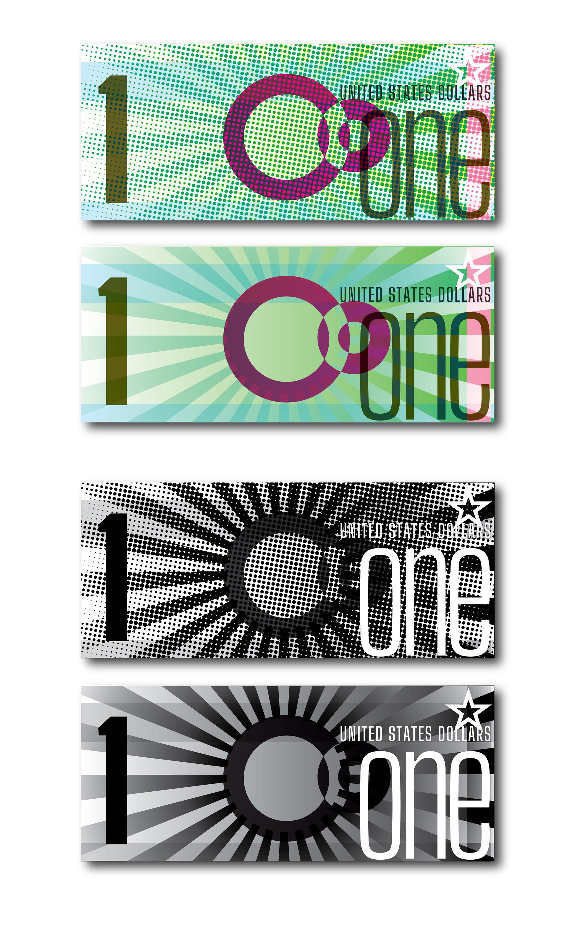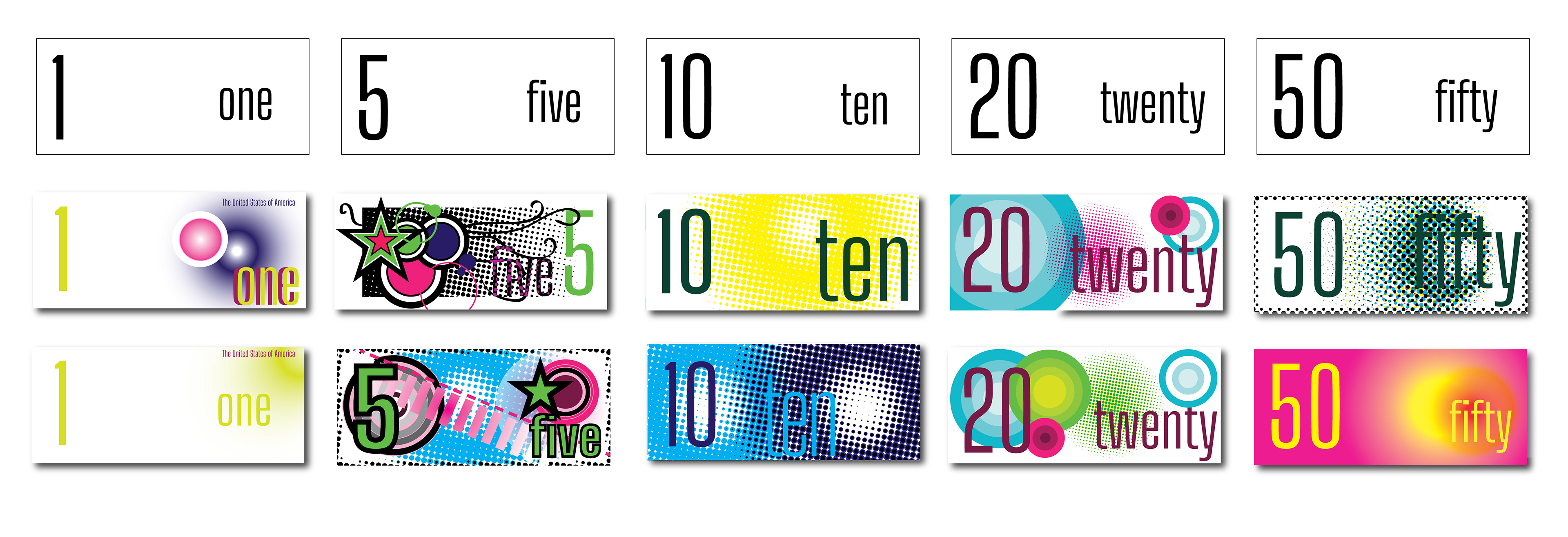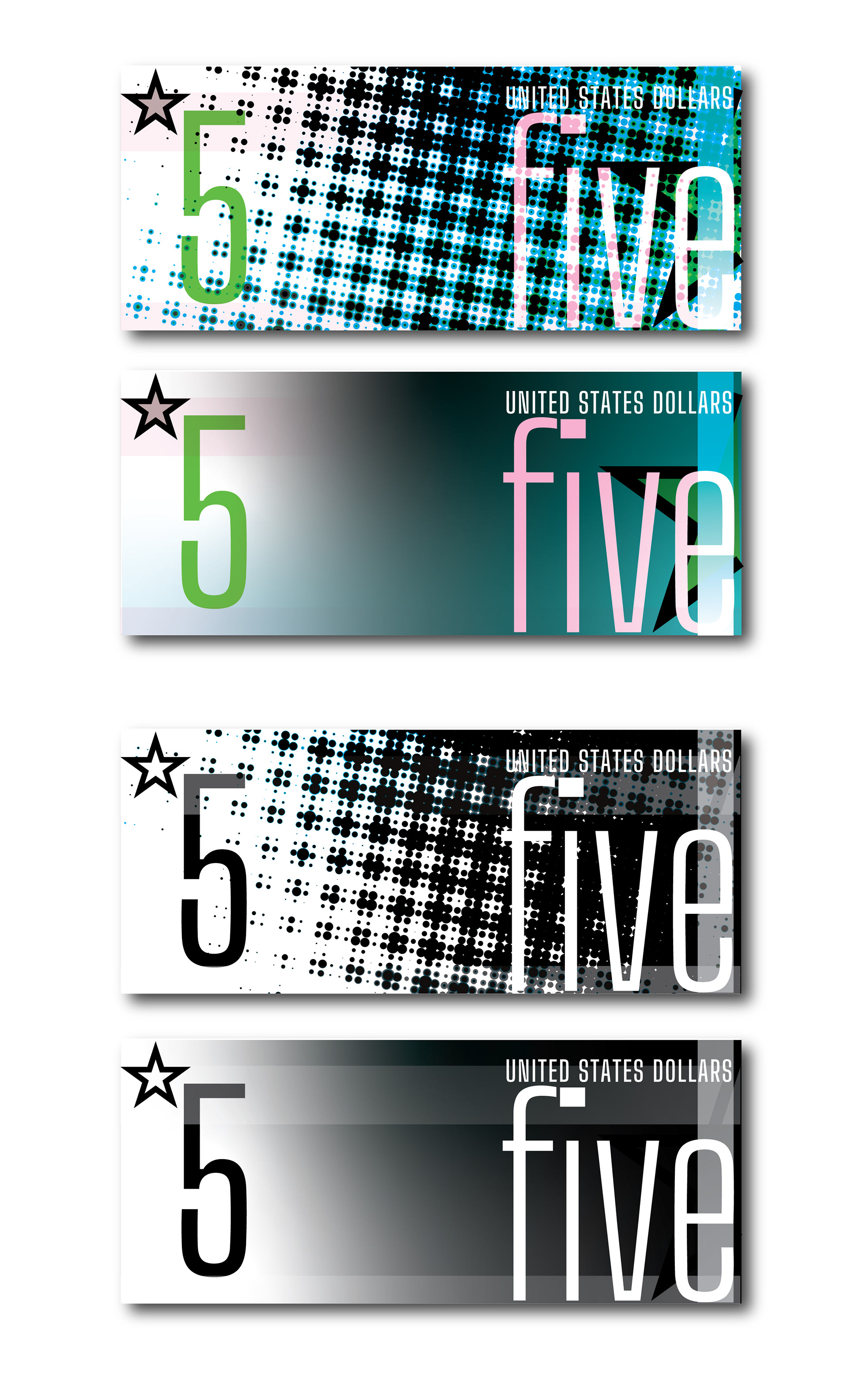 The goal of this project was to design a set of currency inspired by a particular design style. The parameters of the project were to include five denominations, be designed to look like it belongs to the design style by using appropriate visual elements, and making the series of notes cohesive while allowing for variation between each individual note.