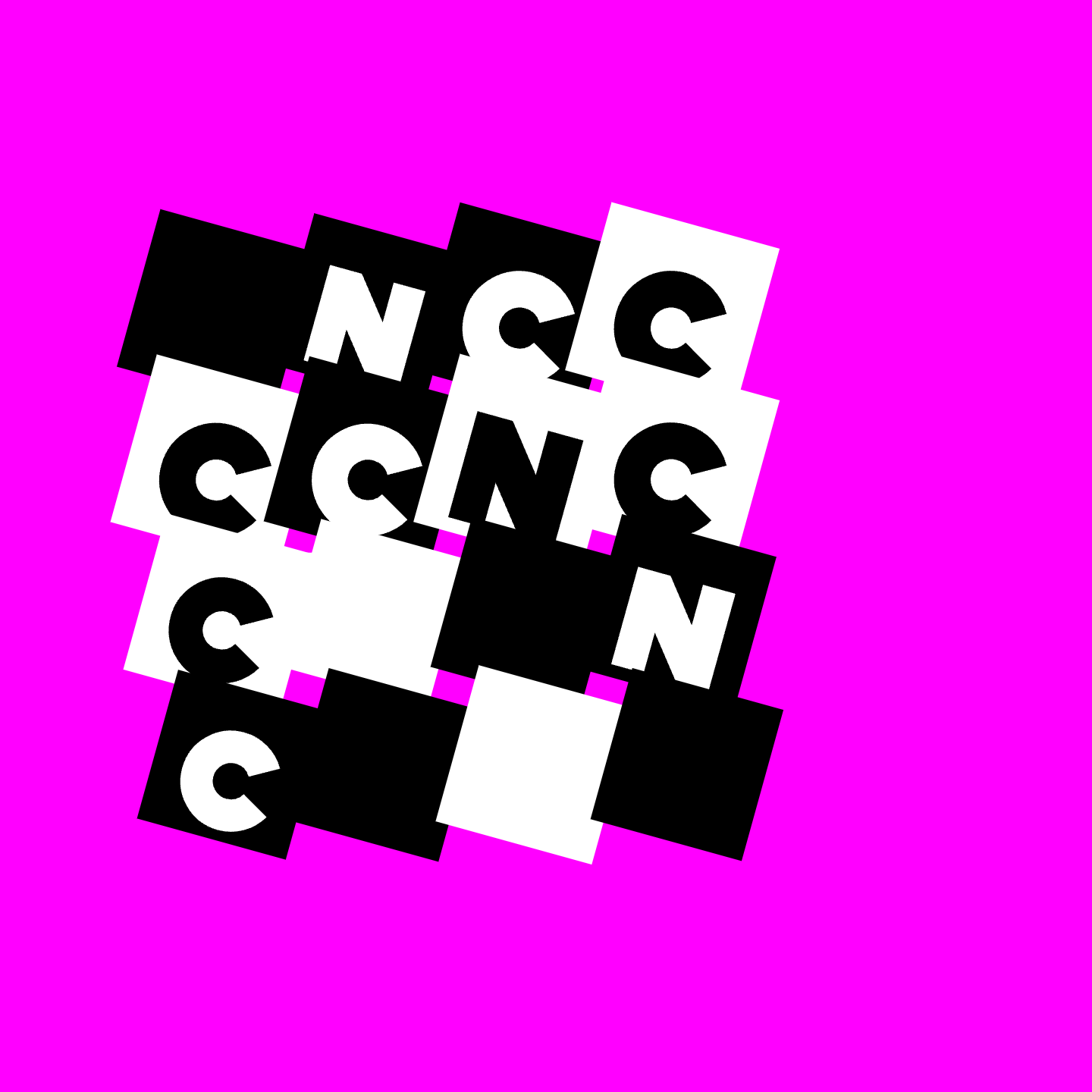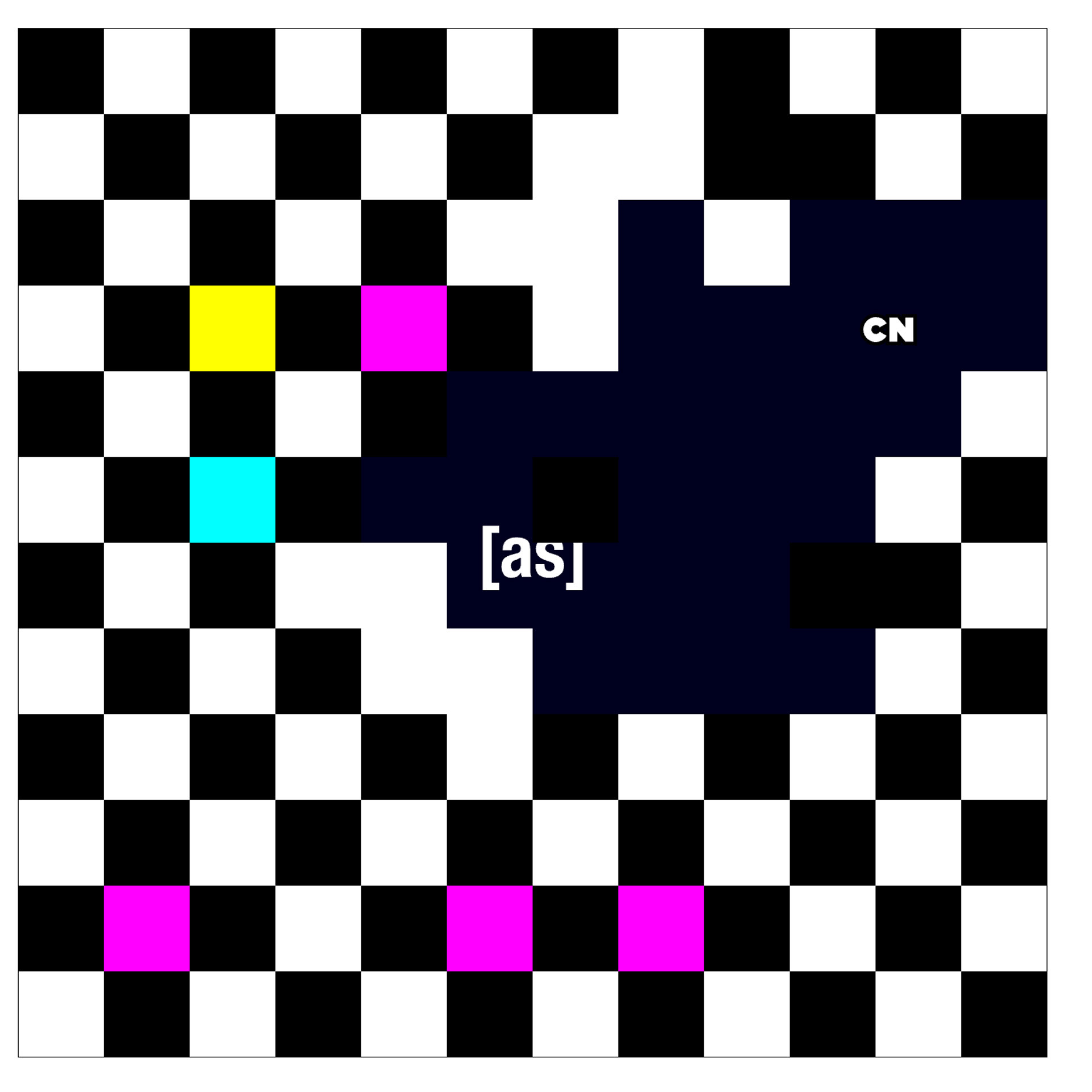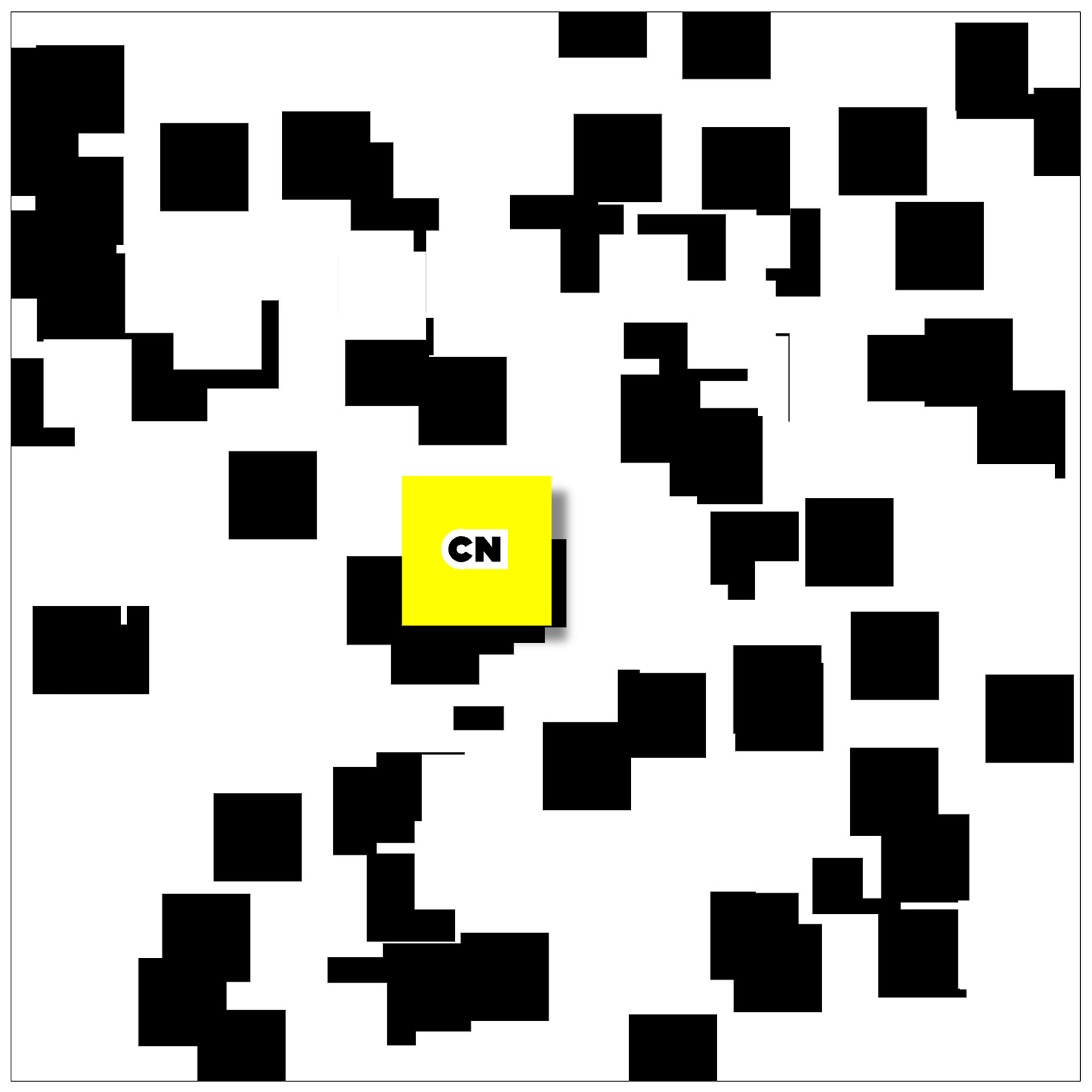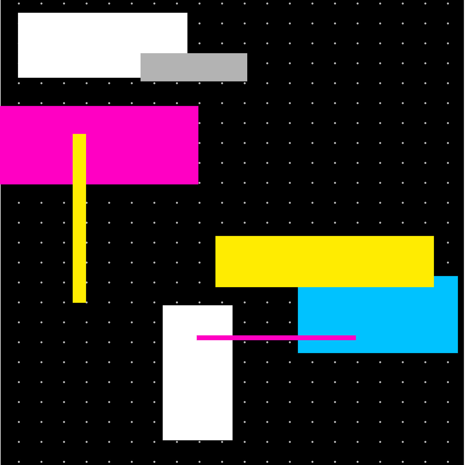 This sketch starts on a white background with one black square that follows the mouse and bounces off the edges of the canvas. When mouse is pressed the background color changes to magenta, cyan, or yellow randomly. Mouse press also freezes the squares in motion. When space bar is pressed, more squares are added with random “C” and “N”. When the mouse is in the center of the screen the squares align to the grid.
