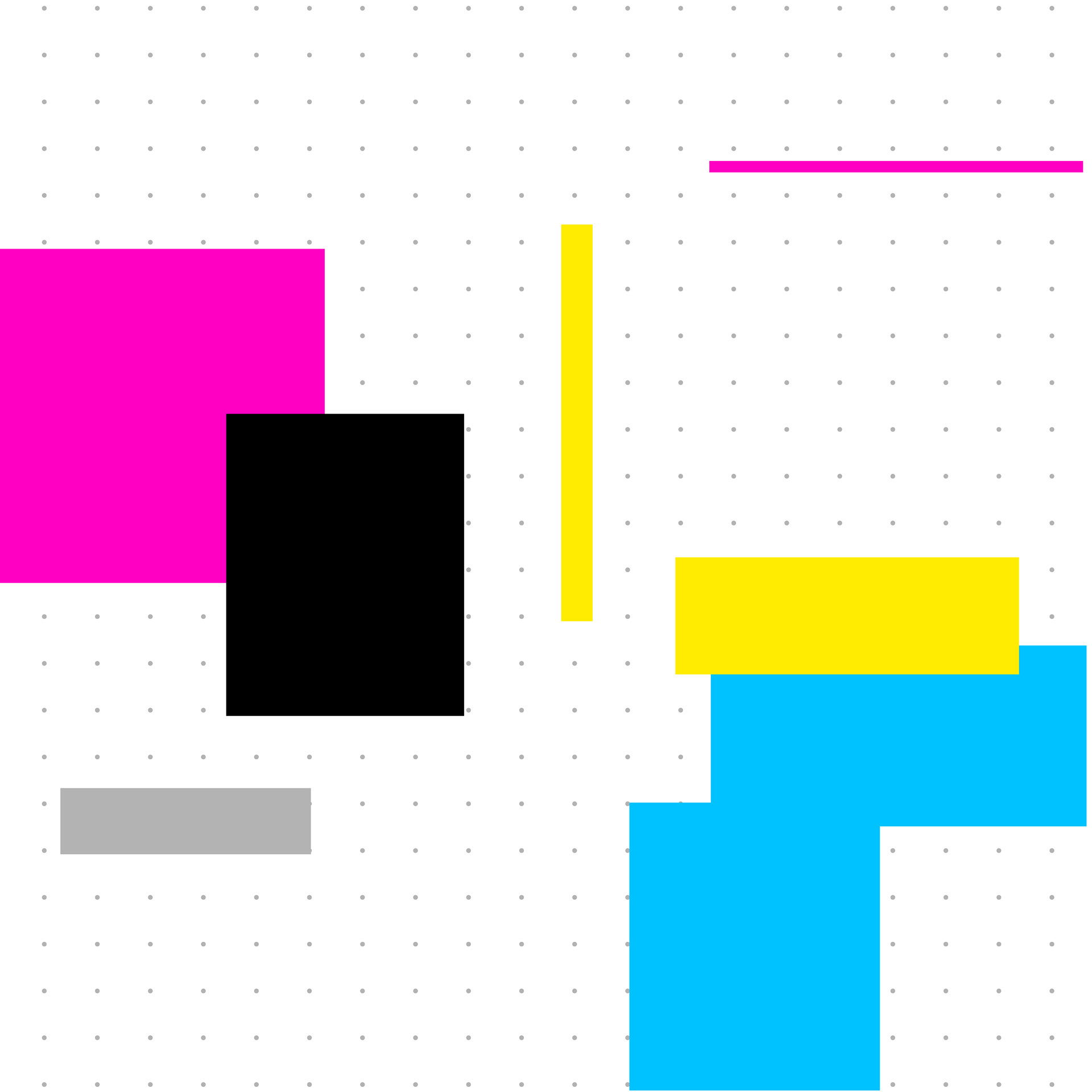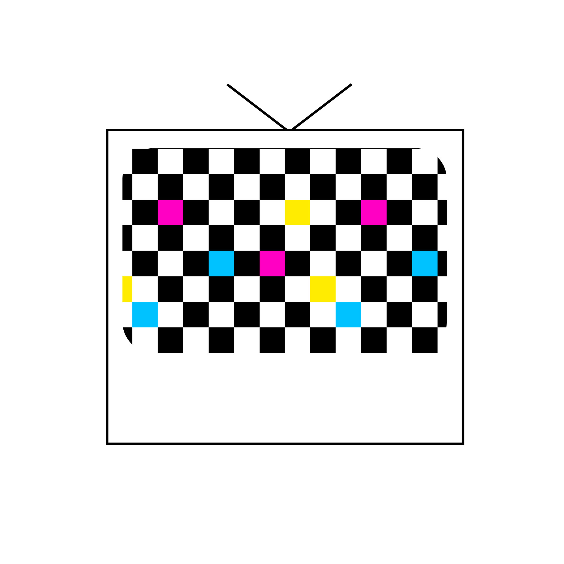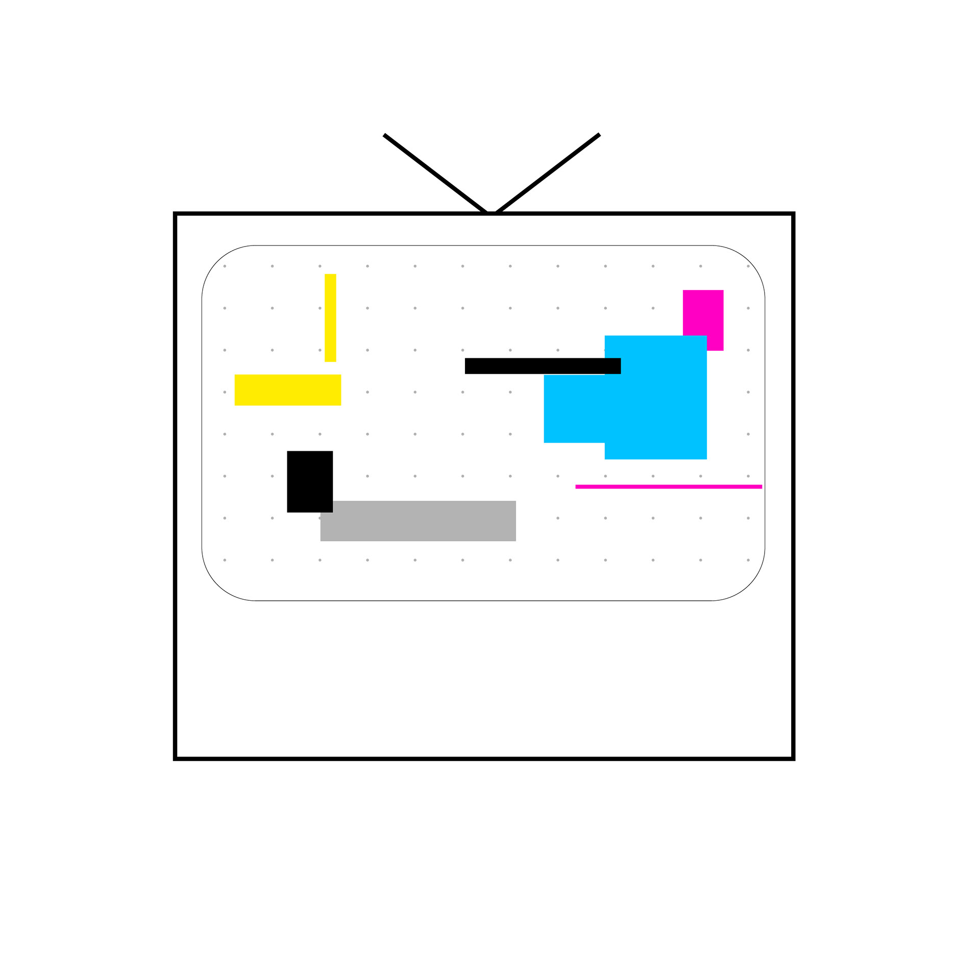 The first coded sketches explore the CMYK color model of Cartoon Network’s brand identity. They also explore a use of negative space, size, and rotation. I decided to add the colors one by one into each sketch and into the checkerboard key. This way the iterations do not become too busy and keep contrast in the background, colors, and shapes.