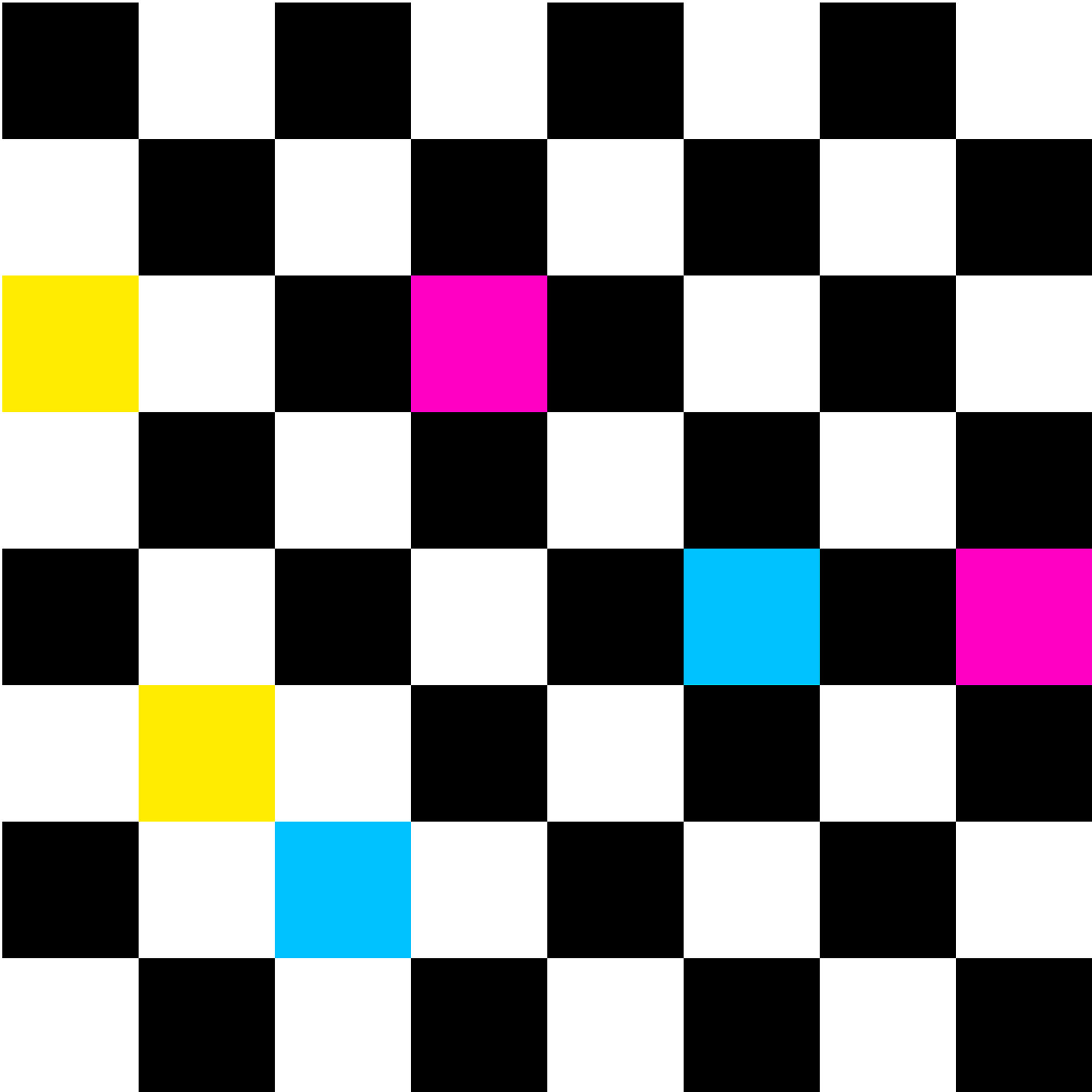 This sketch starts off as a full checkerboard grid and the mouse hovering over a square lets it change colors to either magenta, cyan, or yellow. The square also rises above the rest of the grid. When mouse is pressed the checkers move in an explosion sort of pattern and the mouse hover effect continues. Mouse press then reverts the grid back to its original checkerboard state.