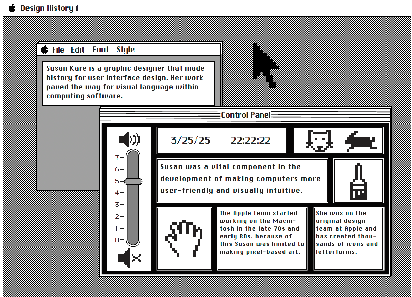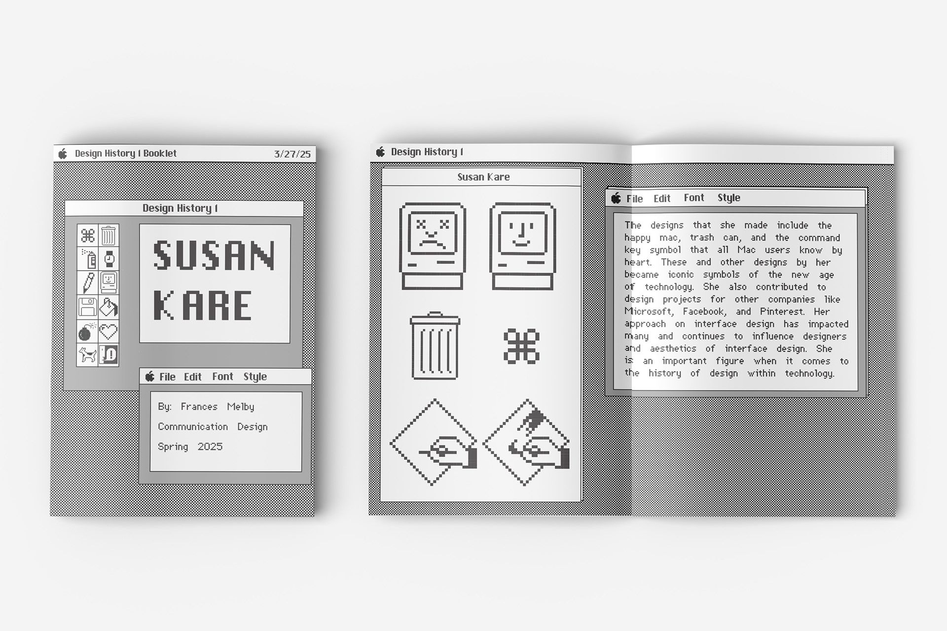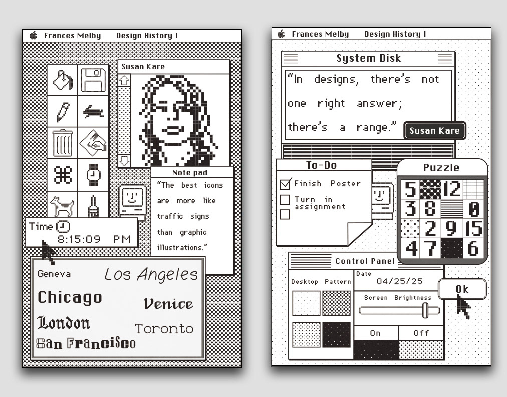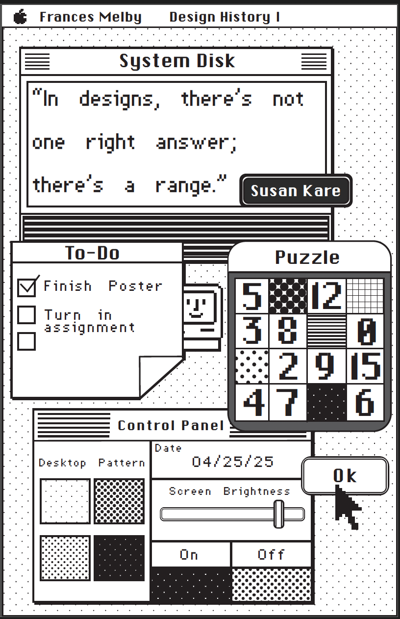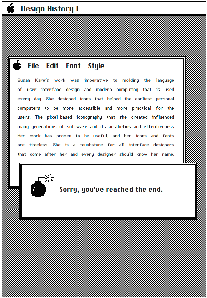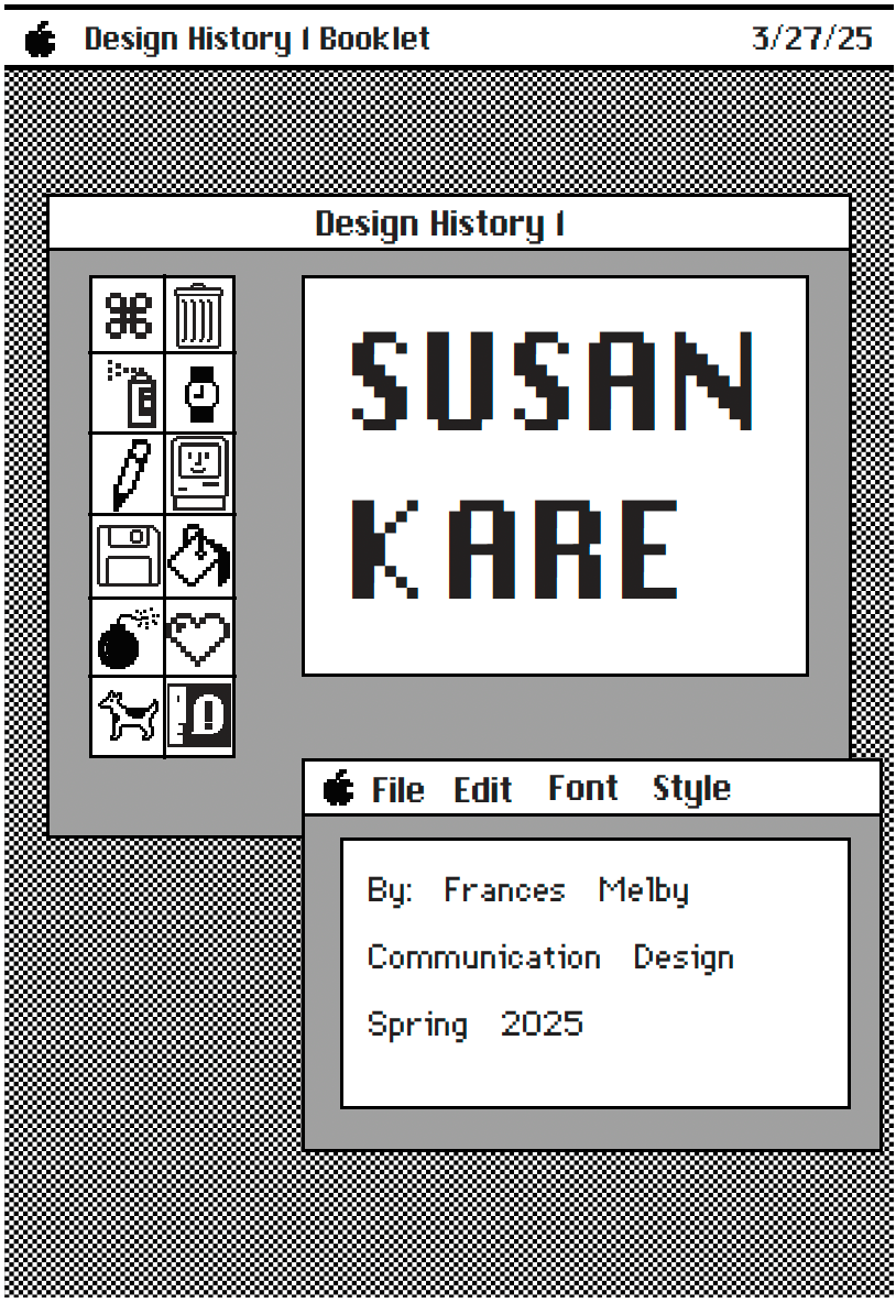 For both of these assignments I took inspiration from the original Macintosh's layout to mimic a home screen. I used the information I learned about Susan to acknowledge her design process and developed an homage to her interface design. I created each aspect of these visual interpretations except for Susan's original fonts, which I downloaded.