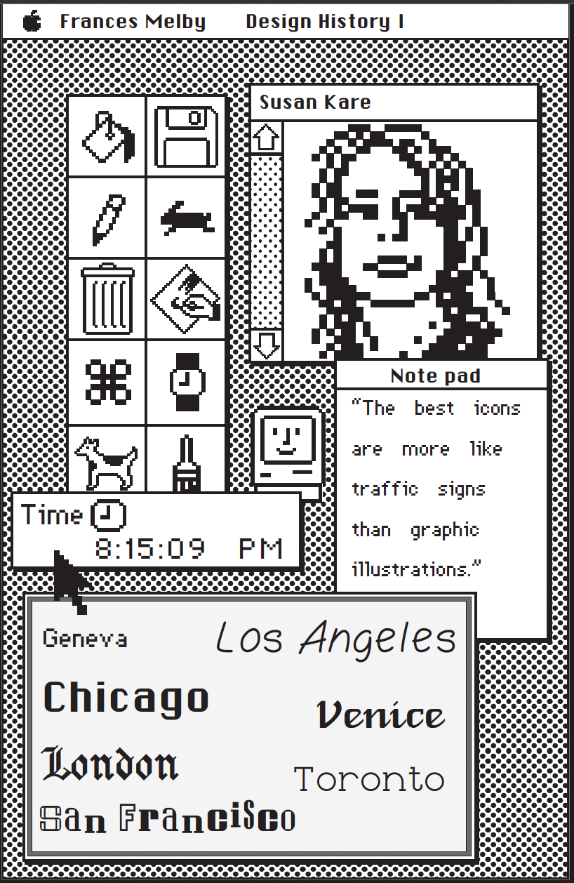 I chose Susan Kare, who is a graphic designer that was on the original design team at Apple. She worked on the Macintosh and created some of the most iconic pixel-based symbols and letterforms that every computer user knows today.